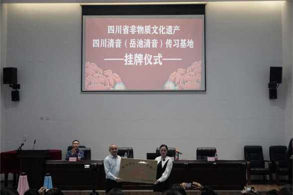 讲座开始前,太阳集团tcy8722还举行了省级非遗项目—四川清音(岳池清音)传习基地的揭牌暨指导老师聘书颁发仪式。