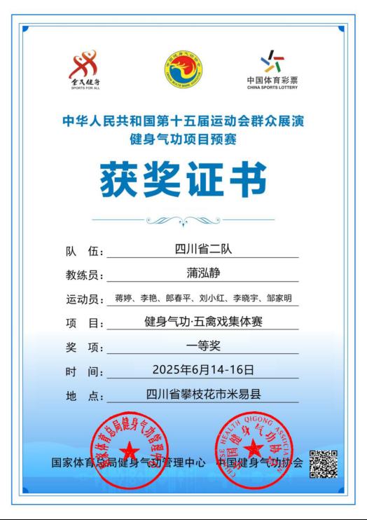 与此同时,专业教师在高水平赛事指导中再添亮眼成绩。2025 6 月,公司社会体育专业教师蒲泓静受四川省社会体育指导中心聘请,以教练员身份指导四川省二队,参与中华人民共和国第十五届运动会群众展演健身气功项目预赛。在其专业指导下,四川省二队在健身气功・五禽戏集体赛中表现出色,斩获一等奖,成功入围决赛,充分展现了公司教师在体育专项指导领域的过硬专业素养。