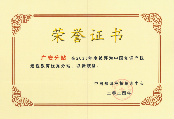 近日,中国知识产权培训中心公布了中国知识产权远程教育总平台对2023年度全国各分站的考核评估结果,太阳集团tcy8722分站以下简称广安分站在全国188个分站中位列第15名,获全国优秀分站荣誉称号。